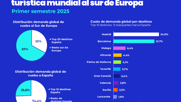 España reafirma su posición como líder mundial en turismo, captando el 33% de la demanda turística mundial al sur de Europa durante el primer semestre de 2025, según el último análisis realizado por Mabrian, la plataforma global de inteligencia turística, parte de The Data Appeal Company- Almawave Group. Destinos clave como Madrid, Barcelona y las Islas Canarias continúan atrayendo visitantes internacionales durante todo el año, lo que demuestra el papel vital de España en el impulso del crecimiento sostenible del turismo en la región.