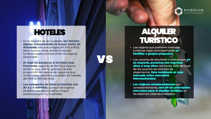 Hay dos excepciones a este patrón de demanda: Buenos Aires y Medellín. En Buenos Aires, las viviendas turísticas y otras alternativas de alojamiento más asequibles son la opción favorita de los viajeros nacionales, y solo el 36,6% opta por alojarse en hoteles durante su estancia en la capital argentina. Medellín, por su parte, es la única ciudad donde un mercado internacional (Estados Unidos) ocupa el primer lugar en la demanda de viviendas turísticas, seguido por el turismo doméstico y los viajeros procedentes de México.
