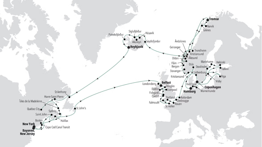 Saliendo de la ciudad de Nueva York, los viajeros recorrerán el este de Canadá antes de cruzar hacia el Reino Unido, Francia, Bélgica, el norte de Europa, incluyendo los fiordos noruegos, el mar Báltico e Islandia, para posteriormente regresar a Bayonne, Nueva Jersey, el 2 de septiembre de 2025. Este viaje inmersivo conectará a los viajeros con los paisajes vírgenes de la región, su fauna única y las experiencias culturales más icónicas.