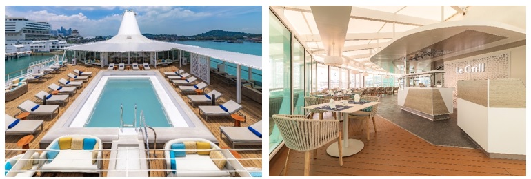 La remodelación incluyó un rediseño contemporáneo del apreciado restaurante Le Grill, una terraza de piscina renovada con una elegante zona de cabañas con sombra, cuatro nuevos camarotes conectados, muebles renovados en todo el barco y la integración de tecnologías sostenibles.