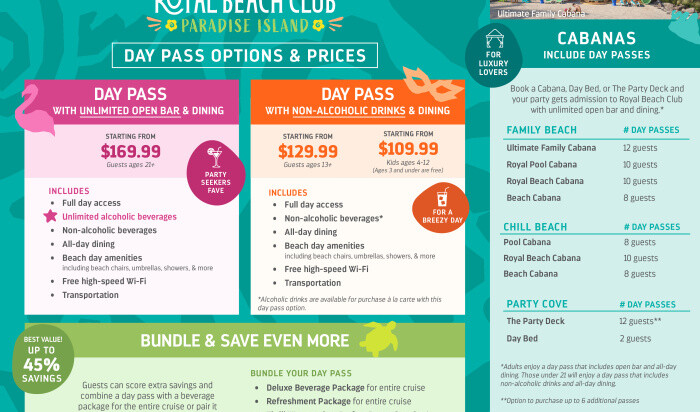 Para más información sobre Royal Beach Club Paradise Island y las opciones de los pases de un día , los invitados pueden visitar el sitio web de Royal Caribbean.