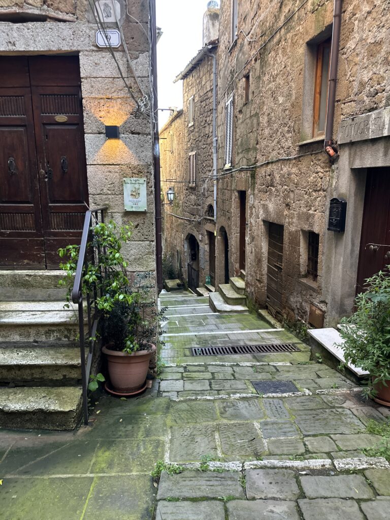 Pitigliano: la ciudad suspendida sobre piedra y memoria La ruta continuó hacia Pitigliano, un lugar que parece flotar sobre la roca. Esta ciudad fue excavada en toba volcánica por los etruscos, y conservada por civilizaciones posteriores. Sus cuevas etruscas, todavía activas como bodegas y almacenes, se encuentran interconectadas formando una red subterránea que atraviesa la ciudad. En la superficie las calles estrechas, los acueductos y las casas de piedra se mezclan con sinagogas, hornos de pan ácimo y baños rituales.
