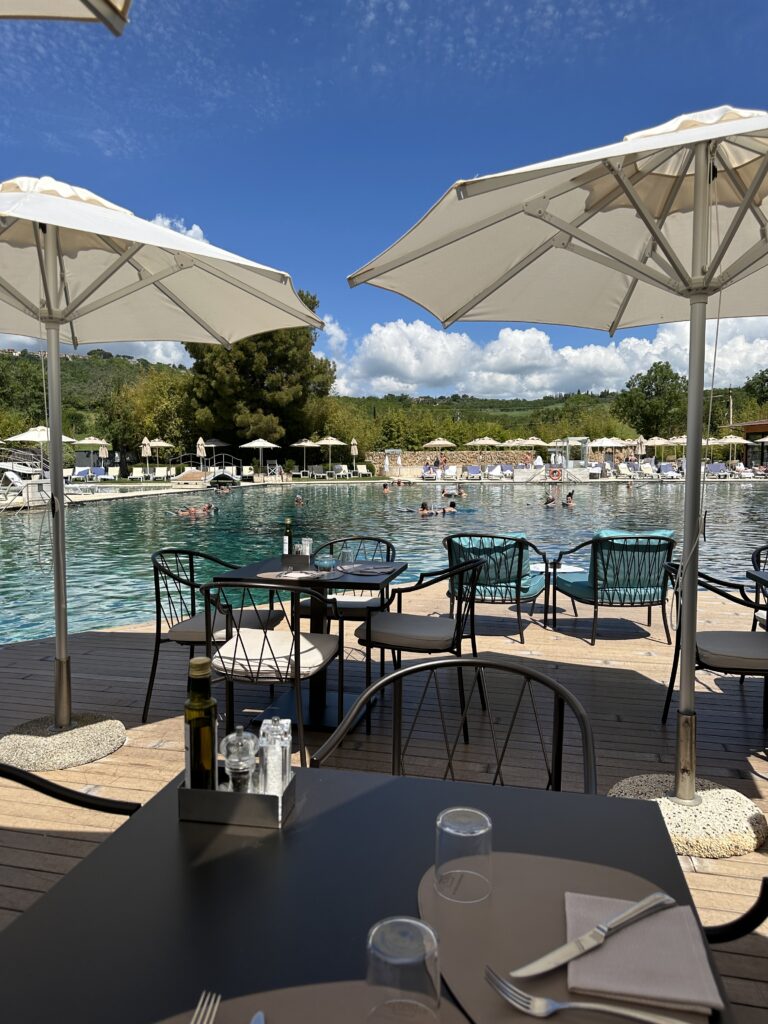 Saturnia y el agua que sana Antes del almuerzo, el grupo visitó el Terme di Saturnia Spa & Golf Resort, donde fueron recibidos por su director, Antonello Del Regno, con un cóctel de bienvenida. Aunque no fuimos alojados allí, sí disfrutamos de un baño en las famosas piscinas termales, alimentadas por un manantial que brota a 37,5°C de forma constante desde hace más de 3.000 años. Lujo, autocuidado y paz se encuentran en el considerado mejor centro termal del mundo.