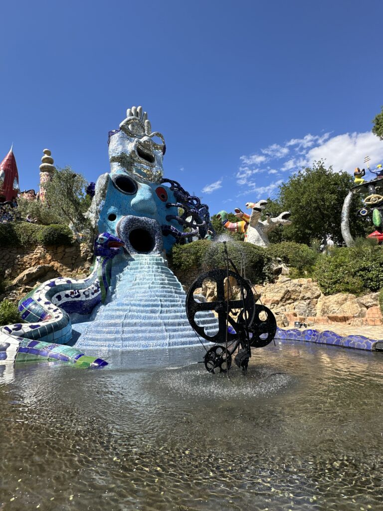 El Jardín del Tarot: arte, esoterismo y libertad creativa Por la tarde, tras la comida en el restaurante Il Frantoio, visitamos el Giardino dei Tarocchi, una obra monumental creada por la artista franco-estadounidense Niki de Saint Phalle. Inspirado por el Parque Güell de Gaudí y los símbolos del tarot, el jardín acoge 22 esculturas de gran formato, coloridas y recubiertas de cerámica, vidrio y espejos. Cada figura representa un arcano mayor y puede ser habitada o atravesada. La autora buscó generar una experiencia de interpretación libre, donde el visitante conecte con su subconsciente a través del arte en un espacio sin normas, lleno de sensualidad, mito y juego.