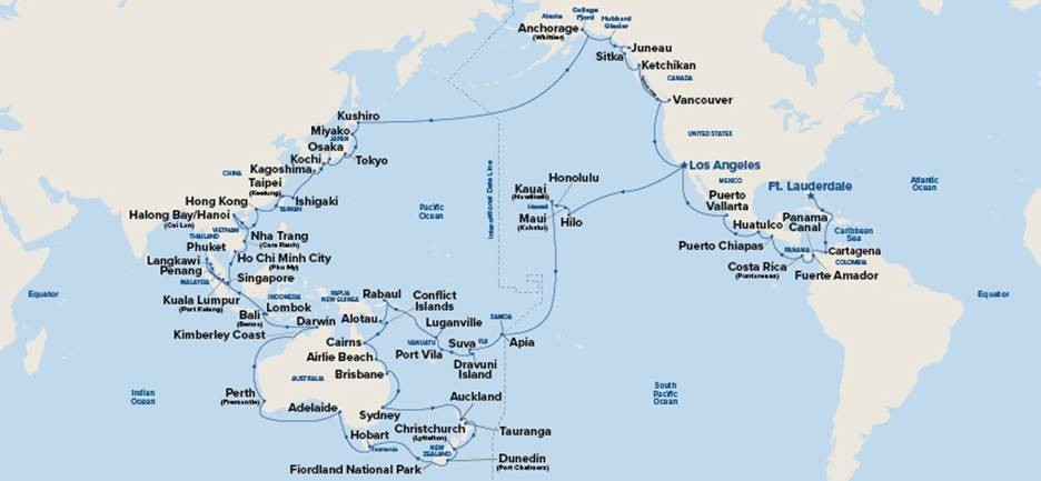 Con nueve pernoctaciones, incluye una noche en Hong Kong y escalas nocturnas en Anchorage (Whittier), Cairns, Honolulú, Osaka, Singapur, Suva, Sídney y Tokio, los pasajeros tendrán tiempo de sobra para explorar y empaparse de las culturas locales. A bordo, el viaje de 35.400 millas náuticas cruza dos veces el Ecuador y la Línea Internacional del Tiempo.