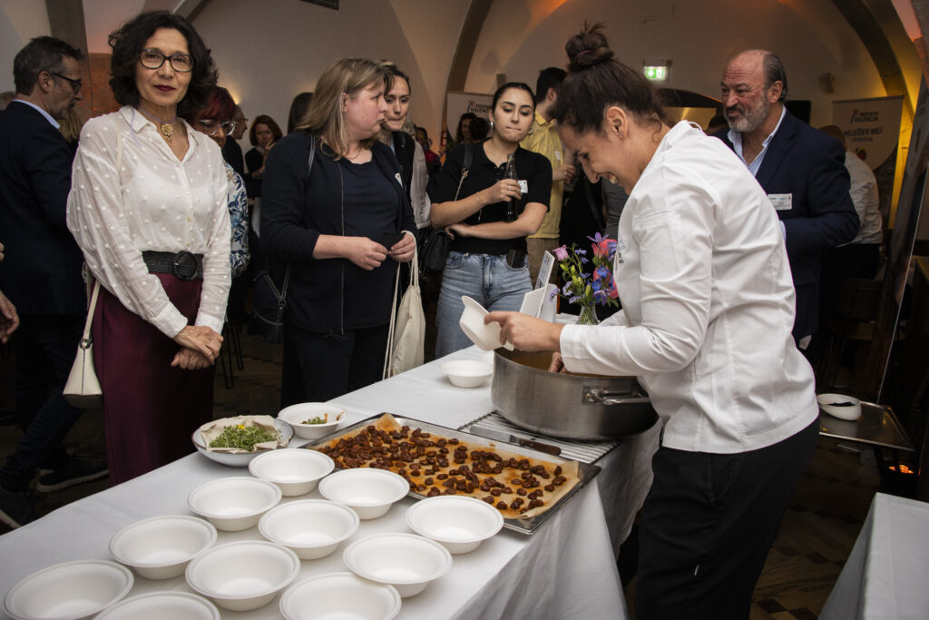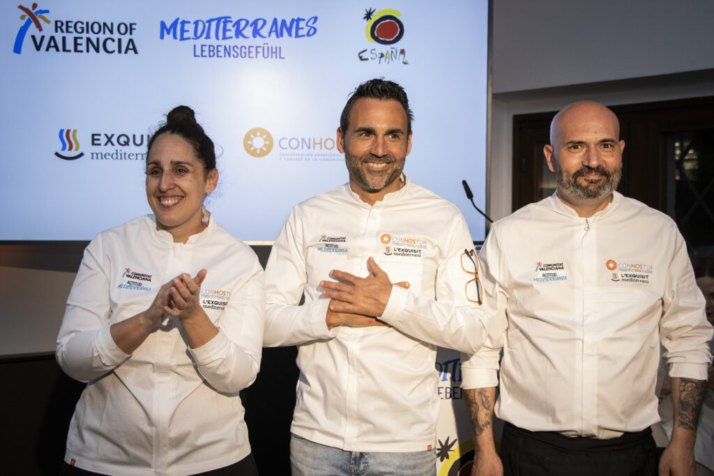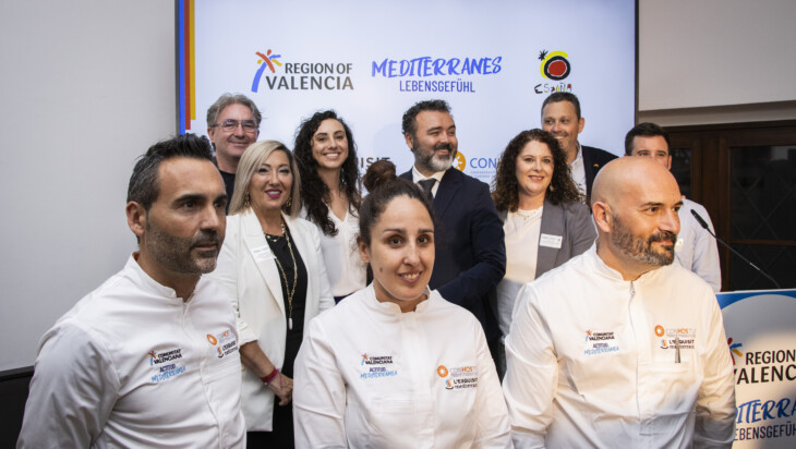En el acto, dirigido a prescriptores del mercado alemán, agencias de viajes, touroperadores, medios de comunicación y revistas especializadas, cada chef ha presentado tapas elaboradas con producto valenciano que el público pudo disfrutar en un cóctel degustación posterior a la presentación del destino. Raul Resino presentó las propuestas “Pez espada de anzuelo escabechado en frío” y “Brandada de mejillones y ortiga de mar”; Roseta Félix las tapas “Col rizada, salsa yodada y huevas de salmón” y “Arroz de cangrejo de la Albufera y tomates semisecos” y Joaquín Baeza las propuestas “Croqueta invertida”, “Costilla de cerdo con coca de curry y cacao” y para finalizar “Bizcocho caliente de mandarina, chocolate blanco y jengibre”.