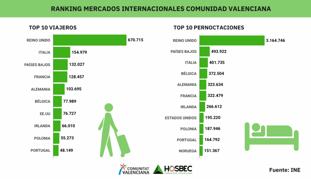 Entre los mercados internacionales, el Reino Unido se mantiene como líder absoluto, con más de 670.000 viajeros y 3,1 millones de pernoctaciones, cifras muy por encima del resto. Le siguen, aunque a distancia, Italia, Países Bajos, Francia y Alemania, que completan el top 5 de emisores más relevantes para la región. Destinos tradicionales que, una vez más, confirman su fidelidad al Mediterráneo valenciano.