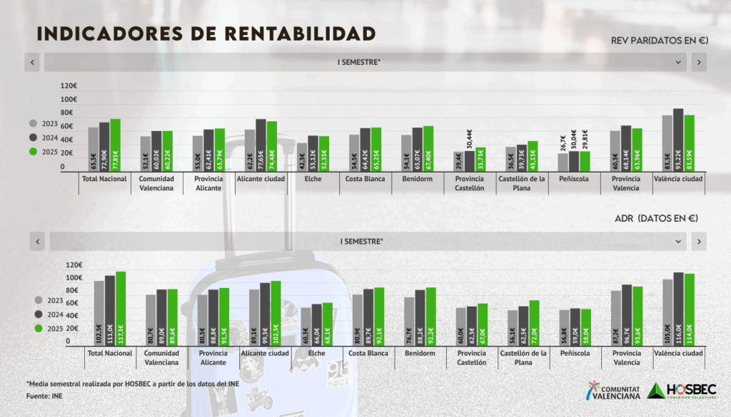 Los primeros seis meses de 2025 dejan también una lectura estable en clave económica para el sector hotelero de la Comunitat Valenciana. La media realizada a través de los datos mensuales del INE, tanto para la tarifa media diaria (ADR) como para los ingresos por habitación disponible (RevPAR), muestra que estos indicadores han mantenido una evolución estable respecto al mismo periodo del año anterior, lo que confirma la consolidación de un modelo turístico más orientado a la rentabilidad y la calidad.