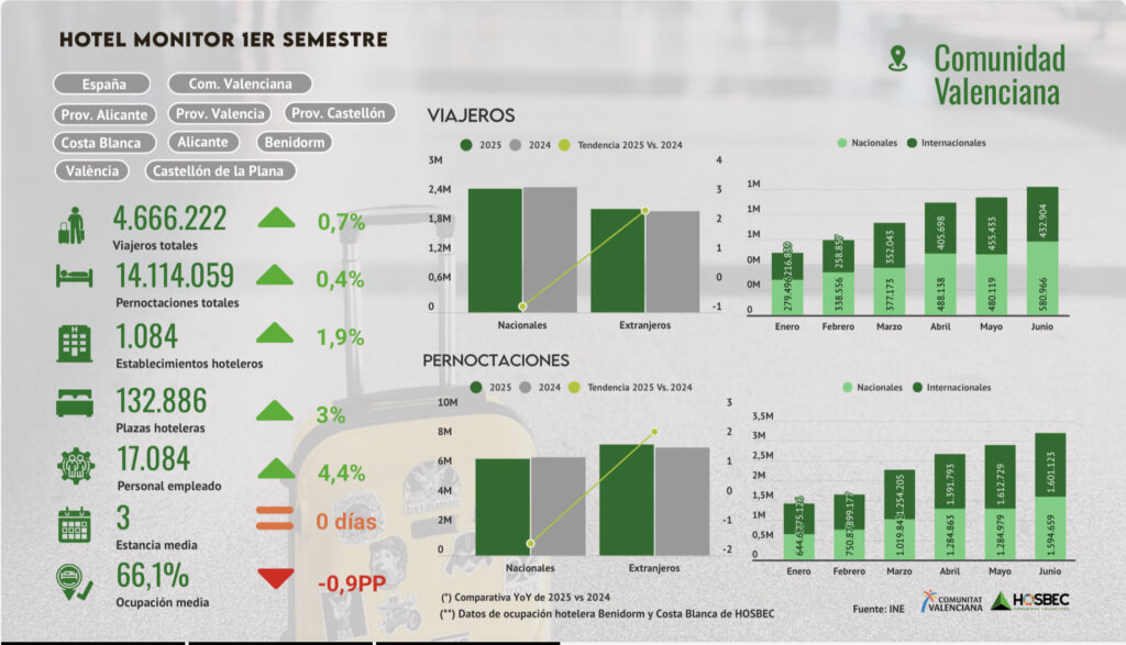 Los hoteles de la Comunitat Valenciana han registrado resultados positivos en el primer semestre de 2025, según los últimos datos publicados por el Instituto Nacional de Estadística (INE). El balance del periodo enero-junio refleja un crecimiento tanto en el número de viajeros como en las pernoctaciones, consolidando la recuperación progresiva del sector.