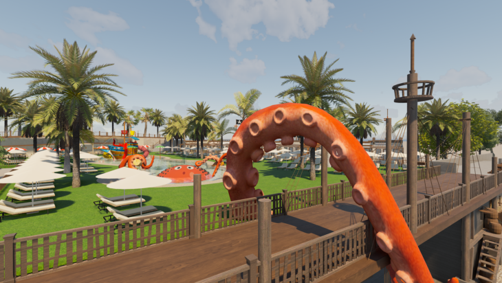El resort ofrecerá tres innovadoras áreas de ocio y descanso con zonas VIP, un kraken gigante y el primer barco pirata del mundo con rocódromo y tirolinas.