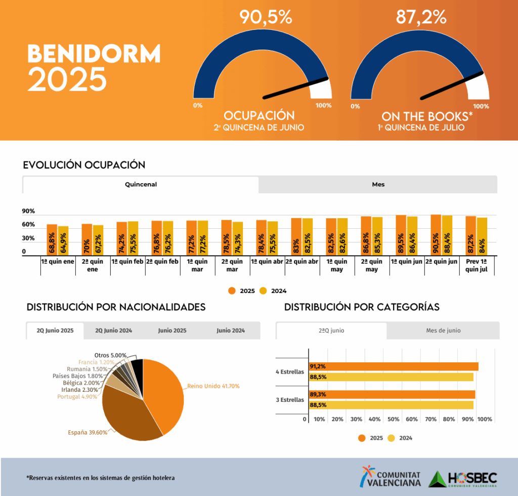 Benidorm se consolida una vez más como el destino con mejores resultados de la Comunitat Valenciana, cerrando el mes de junio con una ocupación media del 89,5%, superando en más de dos puntos el dato del año pasado. La segunda quincena ha sido especialmente destacada, alcanzando un 90,5% de ocupación, lo que evidencia la fortaleza del destino ya en el arranque del verano. Este comportamiento se apoya en el equilibrio entre turismo nacional e internacional, con una ligera ventaja para el mercado británico, que representa el 41,7% de las estancias en la segunda mitad del mes, seguido muy de cerca por el nacional, con un 39,6%. Portugal (4,9%) e Irlanda (2,3%) completan el grupo de mercados más relevantes, junto a Bélgica y Países Bajos.