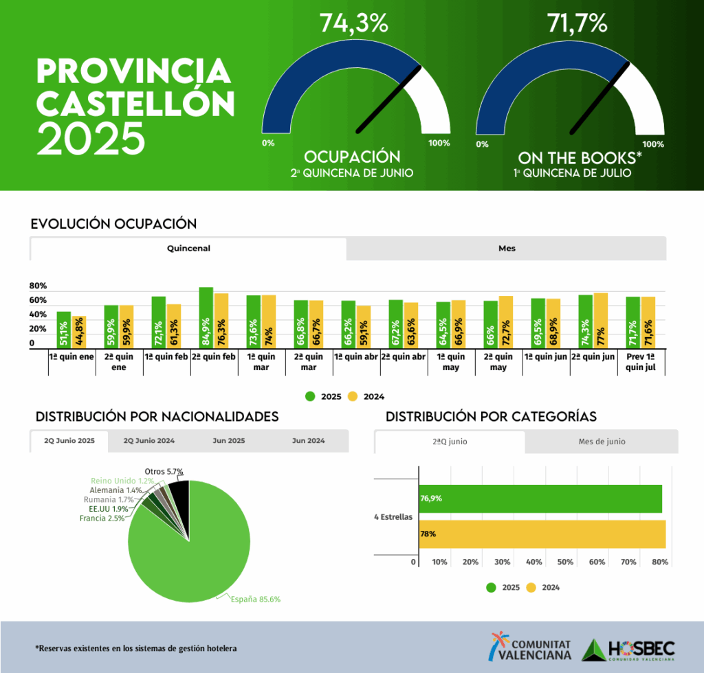 La provincia de Castellón cierra el mes de junio con una ocupación media del 72%, manteniéndose en línea con los registros del año anterior. En la segunda quincena, los datos mejoran hasta alcanzar el 74,3%, mostrando una recuperación paulatina del ritmo turístico a medida que avanza el calendario estival. El mercado nacional continúa siendo el gran motor del destino, representando el 85,6% de las pernoctaciones en esta segunda mitad del mes. Entre los mercados internacionales, destacan Francia (2,5%), EE.UU. (1,9%) y Rumanía (1,7%), mientras que Alemania y Reino Unido aportan cuotas más moderadas, en torno al 1,2%-1,4%.