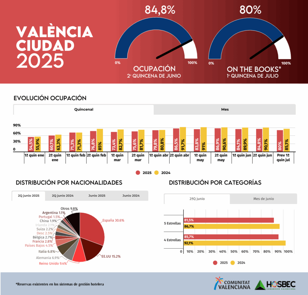 En València ciudad, la ocupación del mes se sitúa en el 84,4%, cinco puntos por debajo de 2024, en una fase de ajuste progresivo. La segunda quincena muestra un dato del 84,8%, con el mercado nacional representando el 30,6% de las estancias, pero con un marcado protagonismo del turismo internacional: EE.UU. lidera el ranking con un 15,2%, seguido de Reino Unido (9,4%), Alemania (6,9%), Italia (6,8%) y Países Bajos (4,5%).