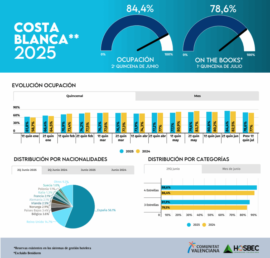La Costa Blanca consolida un buen mes de junio, cerrando con una ocupación media del 82,5%, por encima del dato registrado en 2024 (81,3%). En la segunda quincena, el comportamiento ha sido aún más positivo, alcanzando un 84,4% gracias al empuje del mercado nacional, que representa el 56,1% del total, y al constante respaldo de los principales mercados internacionales. Reino Unido (14,7%) sigue siendo el primer emisor extranjero, con Bélgica (3,6%), Países Bajos (3,4%), Noruega e Irlanda (ambos por encima del 2,5%) completando un abanico europeo diversificado y fiel al destino. Alemania, Francia e Italia también se mantienen estables.