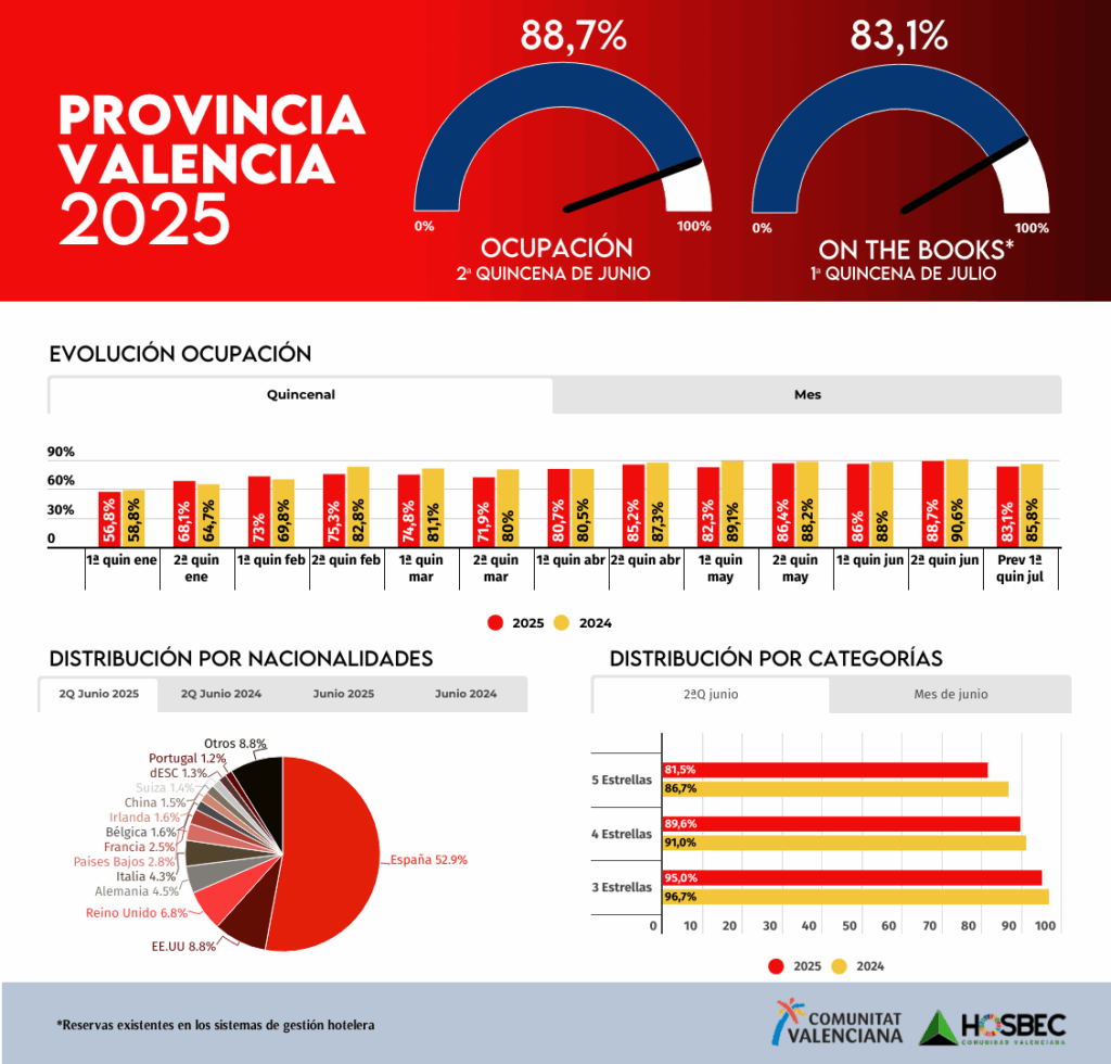 La provincia de Valencia cierra junio con una ocupación media del 87,3%,por debajo del dato del año anterior (89,3%) pero manteniendo un comportamiento sólido, especialmente en la segunda quincena, cuando se alcanzó el 88,7%. El mercado nacional continúa siendo el principal motor, con un 52,9% de cuota en esta segunda mitad del mes, pero destaca el impulso del turismo internacional, especialmente de Estados Unidos (8,8%), Reino Unido (6,8%), Alemania (4,5%) e Italia (4,3%). También contribuyen con fuerza Países Bajos, Francia, Bélgica e Irlanda, consolidando la diversidad de mercados emisores en el destino.