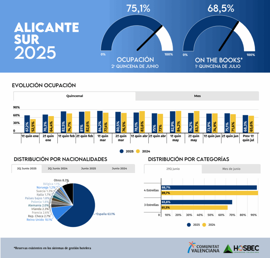 Con la vista puesta en el inicio de julio, las reservas de los sistema de gestión hoteleros ya almacenan el 78,6% en la Costa Blanca y al 68,5% en Alicante Sur. La celebración de San Juan y las tradicionales Hogueras durante la segunda quincena han actuado como catalizadores clave, marcando la transición hacia la temporada alta estival con un fuerte componente de turismo nacional y regional.
