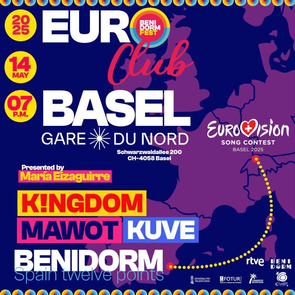 En concreto, se ha programado la acción ‘Euroclub Benidorm Fest Comunitat Valenciana’, una cita que combinará música, cultura, turismo y proyección internacional en Gare du Nord, el centro cultural de la música contemporánea ubicado en la estación ferroviaria Badischer Bahnhof de Basilea. El evento incluirá actuaciones en directo de los artistas Mawot, K!ngdom y Kuve, todos ellos con participación destacada en diferentes ediciones del Benidorm Fest.