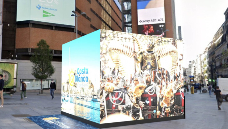 El Patronato Costa Blanca difundirá estos días la provincia de Alicante en el centro de Madrid a través de una original e innovadora acción de street marketing. La propuesta, que se desarrolla en el marco de la Feria Internacional de Turismo FITUR 2025, contempla la instalación de un gran cubo LED en la Plaza del Callao en el que se proyectarán vídeos de promoción y donde se realizarán presentaciones, desfiles y actuaciones.
