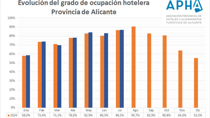 Los datos reales y definitivos de los establecimientos hoteleros y apartamentos asociados de APHA cifran en 87,0% la tasa de ocupación turística de la provincia de Alicante para julio, lo que supone un ascenso de 0,5 puntos porcentuales respecto al mismo mes de 2024. Es el mejor dato del año. Los indicadores económicos indican que la tarifa media ha retrocedido levemente, mientras que la rentabilidad por habitación ha sido algo superior a la de julio del pasado año.