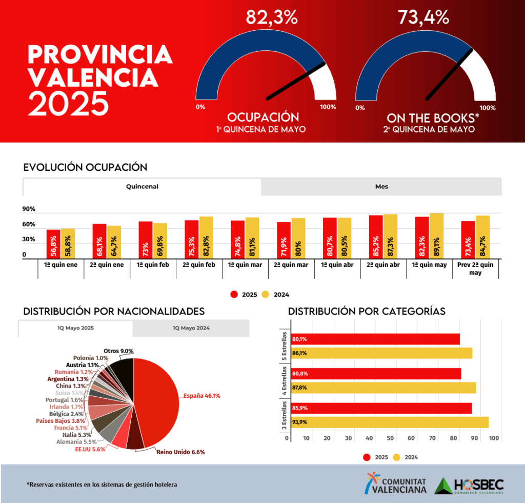 Durante la primera quincena de mayo de 2025, la Provincia de Valencia ha registrado una ocupación hotelera del 82,3%, lo que supone un descenso de casi 7 puntos respecto al mismo periodo de 2024 (89,1%). Este ajuste afecta a todas las categorías hoteleras, aunque especialmente a los establecimientos de 3 estrellas, que bajan del 93,9% al 85,9%, mientras que los de 4 estrellas caen hasta el 80,8% y los de 5 estrellas al 80,1%.