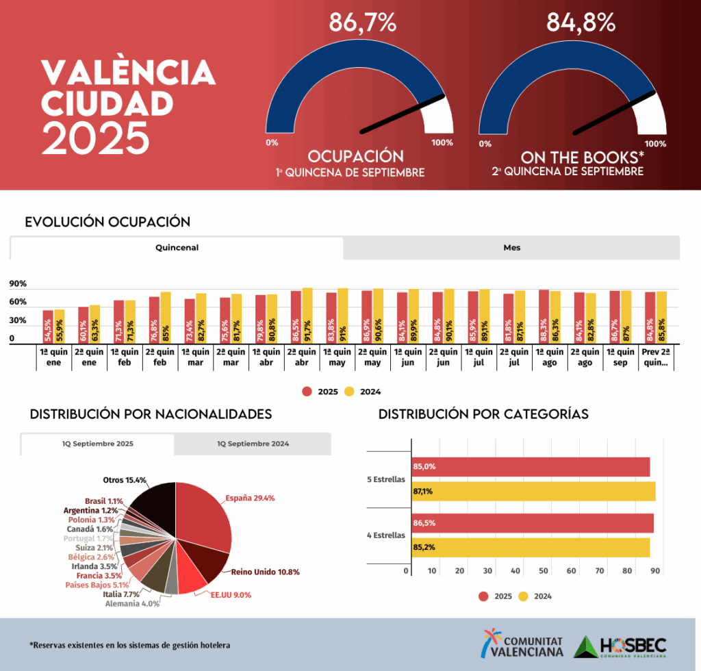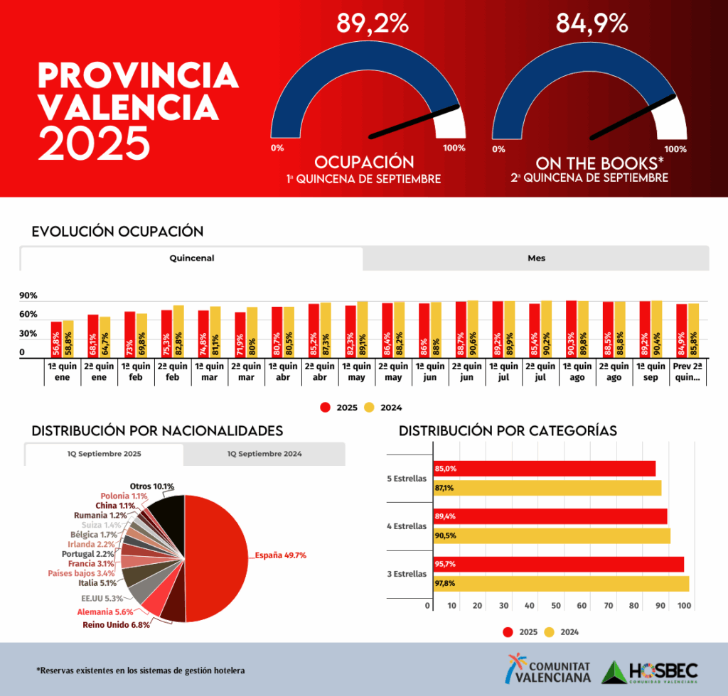 La provincia de Valencia arranca septiembre con una ocupación hotelera del 89,2% en la primera quincena, un registro que apenas se distancia del 90,4% alcanzado en el mismo periodo de 2024. Estos resultados muestran la fortaleza del destino y confirman que septiembre se consolida como extensión natural de la temporada alta. El turismo nacional sigue siendo mayoritario, rozando el 50% de los viajeros, pero destaca también el dinamismo de mercados internacionales como Reino Unido (6,8%), Alemania (5,6%) y Estados Unidos (5,3%), que continúan reforzando la proyección exterior del destino.