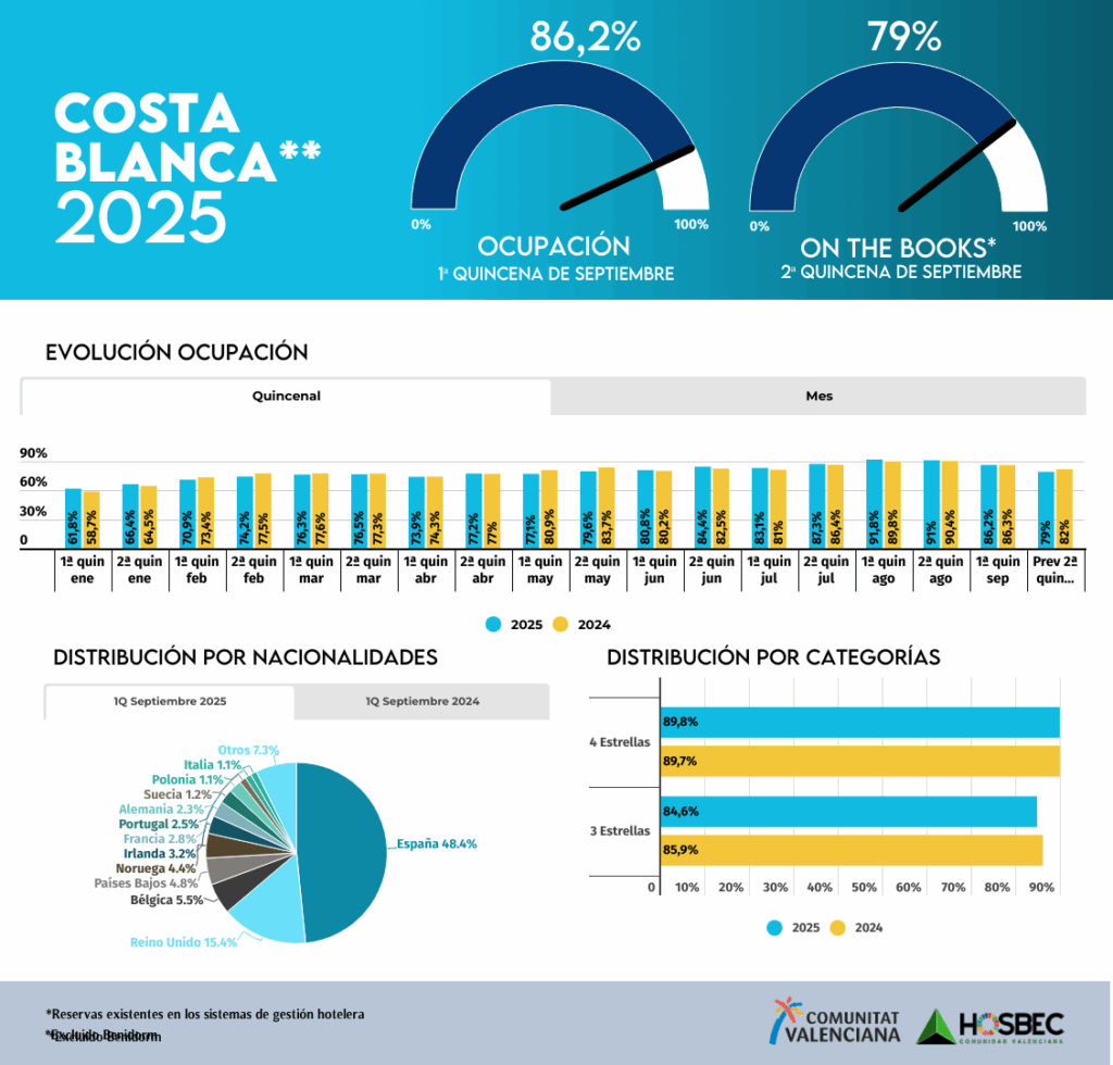 La Costa Blanca mantiene en septiembre la inercia de un verano sólido, con una ocupación del 86,2% en la primera quincena, prácticamente calcada al 86,3% registrado en 2024. El destino confirma así su estabilidad, apoyado en una fuerte presencia del turismo nacional (48,4%), pero también en un abanico internacional muy diverso donde Reino Unido (15,4%), Bélgica (5,5%) y Países Bajos (4,8%) se sitúan entre los principales emisores. La aportación de los países nórdicos, con Noruega y Suecia en torno al 6% conjunto, completa un panorama que muestra la fidelidad de mercados consolidados a la hora de elegir este litoral.
