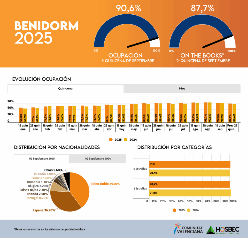 Benidorm encara septiembre con la misma firmeza y dinamismo que ha caracterizado su temporada alta, anotando en la primera quincena una ocupación del 90,6%, un dato prácticamente idéntico al 90,9% alcanzado en 2024. La ciudad mantiene así un nivel de actividad que consolida su liderazgo turístico en el Mediterráneo, avalado por una planta hotelera que supera las 40.000 plazas y que la sitúa entre los destinos más competitivos de España.