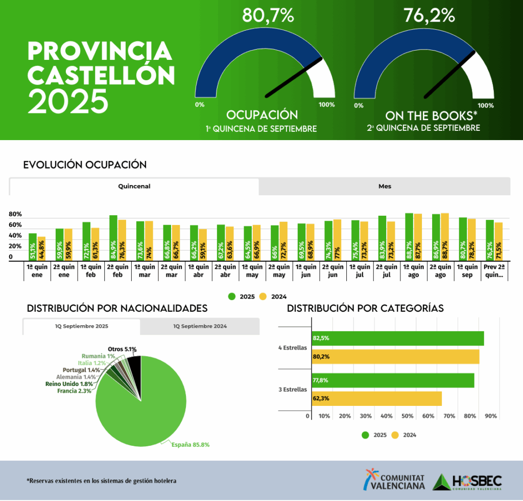 La provincia de Castellón mantiene el pulso turístico en la primera mitad de septiembre, con una ocupación del 80,7%, lo que representa una mejora de 2,5 puntos porcentuales respecto al mismo periodo de 2024 (78,2%). Este resultado confirma que septiembre se consolida como una extensión natural del verano, con una demanda que apenas cede frente al tramo más fuerte de la temporada.