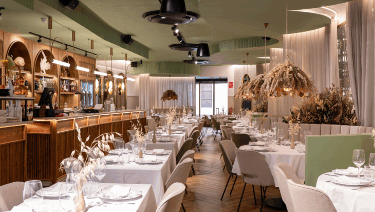 También es fundamental la disposición de las mesas, que aseguran amplitud, privacidad y comodidad. Están vestidas con manteles blancos y una vajilla clásica, que eleva la sensación de elegancia. El mobiliario combina sillas tapizadas en tonos neutros y sofás curvos que abrazan mesas redondas, creando rincones íntimos para compartir. Destaca una espectacular vinoteca acristalada en la pared principal, que no solo exhibe la extensa selección del restaurante, sino que también funciona como un punto focal decorativo y funcional.