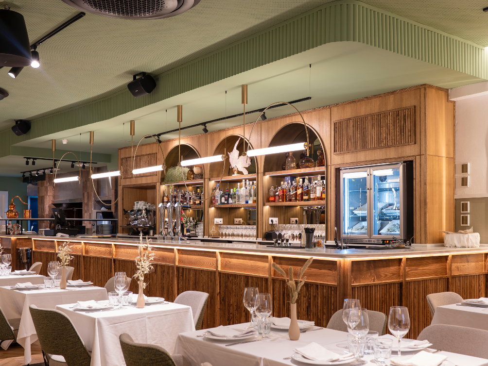 Por último, encontramos la barra, realizada en madera natural y enmarcada por arcos con retroiluminación cálida. Funciona como antesala al comedor, pero también es un espacio para un aperitivo informal, integrando perfectamente lo funcional con lo estético. Y es que, con esta renovación, Puerta del Mar no sólo se reafirma como un emblemático punto para disfrutar de la gastronomía mediterránea en el centro de la ciudad, sino también como un espacio donde cada detalle, desde la iluminación hasta el mobiliario, ha sido pensado para elevar la experiencia del comensal y conectar con el Mediterráneo.