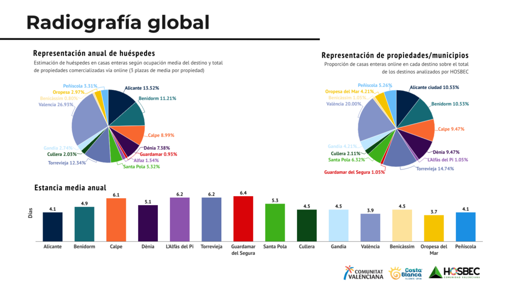 En la primera radiografía global, la primera conclusión llamativa es que la ciudad de València aloja en vivienda turística casi el 27% del total de los huéspedes, aunque sólo tiene el 19% de las viviendas. Aun así, es el municipio con mayor número de propiedades comercializadas. Sin embargo, por provincias, Alicante es el territorio que concentra un mayor número de viviendas, acorde a su importancia turística: el 63% se sitúan en esta provincia con Torrevieja como mayor núcleo con casi el 15% del total. Para Castellón, Peñíscola y Oropesa son los principales núcleos de operación de las viviendas turísticas con capacidades en cada municipio de un 5%. Los destinos castellonenses son los que menos variación de viviendas han experimentado incluso creciendo ligeramente en Oropesa y Benicàssim.