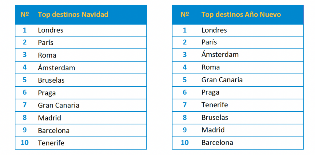 Otras ciudades que destacan en el top 10 son Bruselas, que aparece entre las cinco primeras posiciones, Praga, que mantiene su atractivo navideño posicionándose en el sexto lugar, y Ámsterdam, que gana protagonismo especialmente en Año Nuevo, escalando hasta el tercer puesto en reservas.