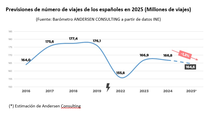 Desde Andersen Consulting anuncian un leve descenso en el número de viajes, llegando en 2025 hasta los 164,6 millones, un dato que representaría un 1,3% por debajo de los viajes del año anterior, donde se produjeron 166,8 millones viajes en total.