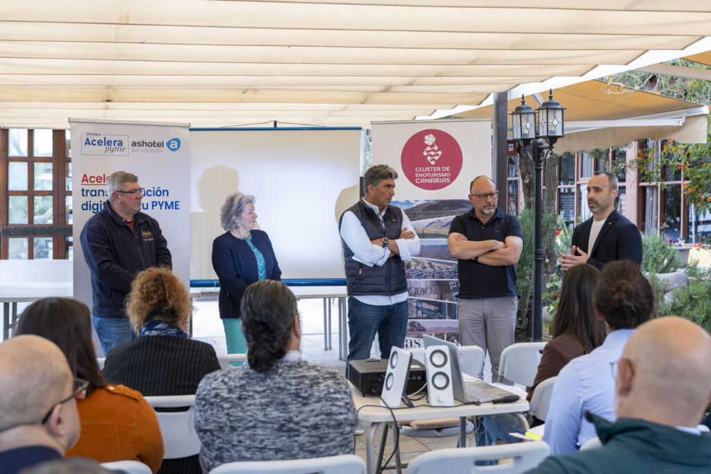La digitalización de las pymes como un conjunto de procesos que mejoran la eficiencia y rapidez en los procesos diarios de las pymes es clave para avanzar también hacia un modelo empresarial más sostenible y competitivo. Es la idea clave de la séptima sesión de Wine & TICS, el programa de la Oficina Acelera pyme de Ashotel que ayuda a implantar la digitalización en las pymes, y que se celebró en Bodegas Reverón, en Vilaflor. Este programa, organizado en colaboración con el Clúster de Enoturismo de Canarias, conecta oferta y demanda de nuevas tecnologías en un ambiente distendido.