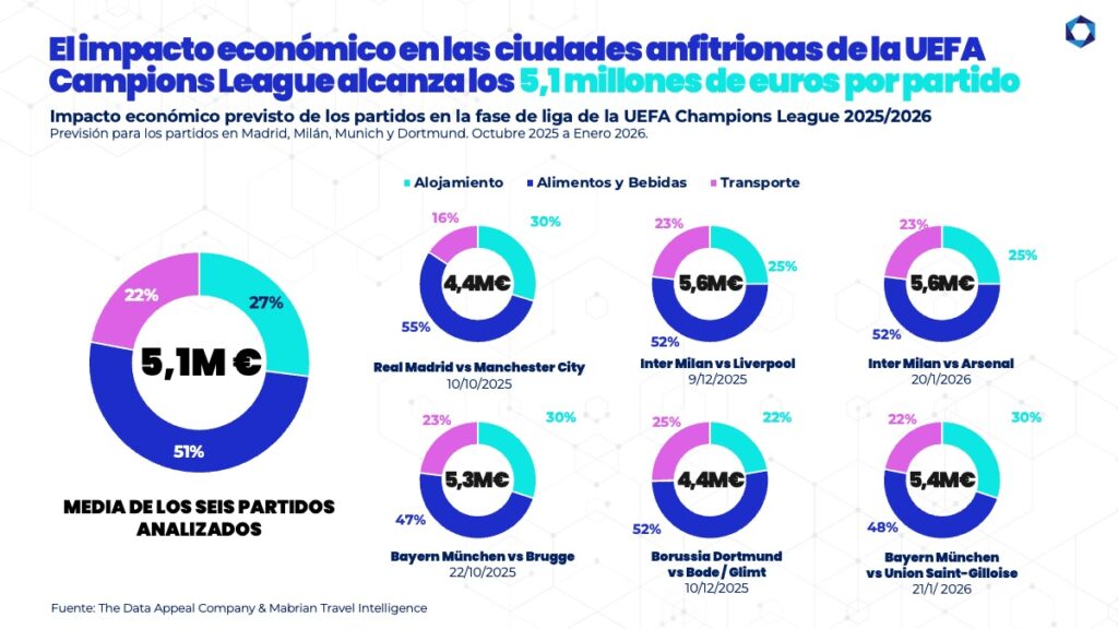 Con la fase de liga de la UEFA Champions League 2025/2026 en plena ebullición, Mabrian y The Data Appeal Company – Almawave Group han puesto en seis partidos de fútbol emblemáticos de este torneo, que se celebrarán en España, Italia y Alemania, y que tendrán un impacto turístico estimado de 5,1 millones de euros de media en cada una de las ciudades anfitrionas analizadas.