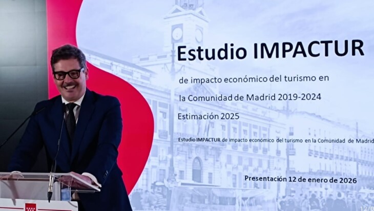 Mariano de Paco Serrano, consejero de Cultura, Turismo y Deporte de la Comunidad de Madrid, presentó, junto a Óscar Perelli, vicepresidente de Exceltur, en Estudio sobre el Impacto Económico del Turismo en la Comunidad de Madrid 2019-2024 con cifras extraordinarias de turismo que podrían llegar a 28.569 millones de euros en 2025, un 8,7% del PIB de la Comunidad, y generar más de 300.000 empleos estables.