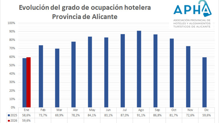 2026 arranca con una ocupación turística del 59,6% en la provincia de Alicante, 1 punto más que hace un año y mejor registro para enero