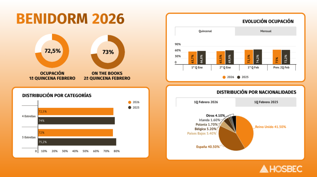 De cara a la segunda quincena, las reservas confirmadas ya alcanzan el 73%, ligeramente por encima del dato de cierre de la primera mitad del mes. Si el ritmo de última hora acompaña, febrero podría estabilizarse en cifras muy similares a las de 2025. Benidorm, en definitiva, no crece, pero resiste con firmeza, apoyado en su mercado británico y en una estructura internacional que sigue siendo su principal seguro en temporada baja.