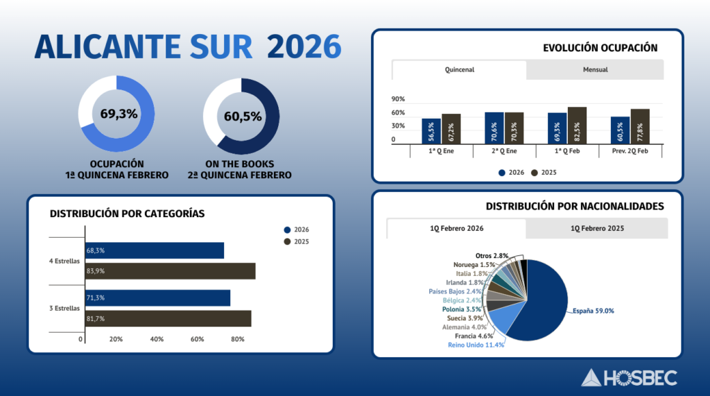 De cara a la segunda quincena, las previsiones apuntan a continuidad del dinamismo, con reservas del 73,7% en la Costa Blanca y del 60,5% en Alicante Sur, anticipando un cierre de febrero con estabilidad en la actividad turística.