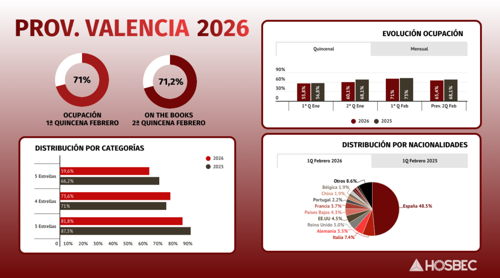 La Provincia de Valencia y València mantienen en la primera quincena de febrero un comportamiento turístico estable, con ligeros ajustes respecto al pasado año. La provincia alcanza una ocupación del 71%, dos puntos por debajo de 2025, mientras la ciudad se sitúa en el 71,2%, igualando el ejercicio anterior.