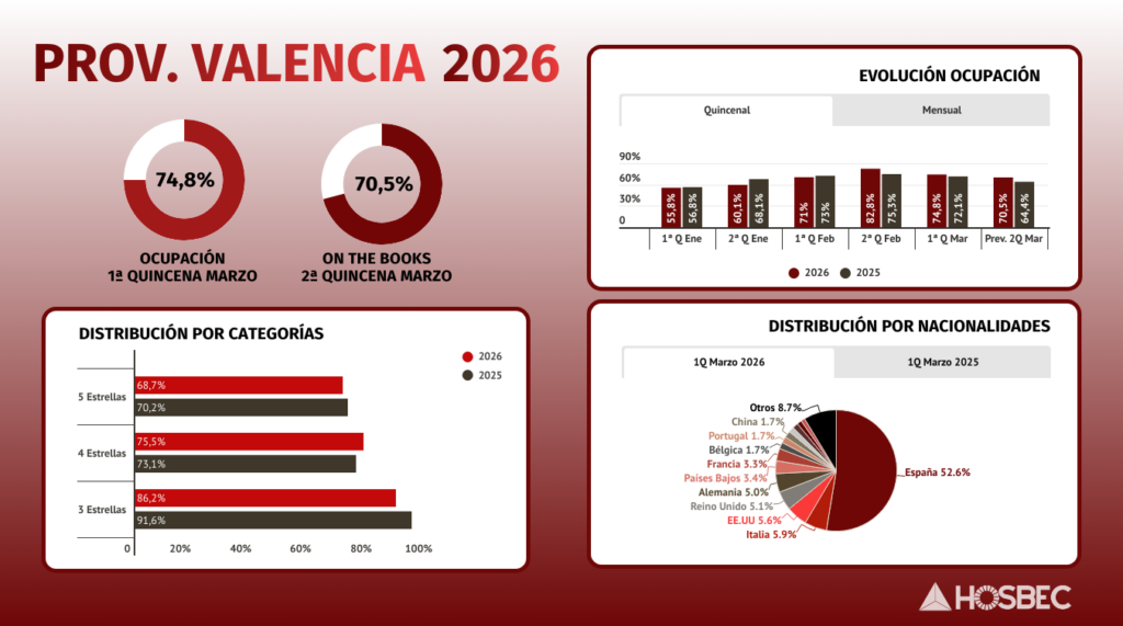 La Provincia de Valencia inicia marzo con una evolución positiva, alcanzando una ocupación del 74,8% en la primera quincena, casi tres puntos por encima del 72,1% registrado en 2025. Este crecimiento se apoya en una demanda sólida y diversificada, en un contexto marcado además por el inicio del tirón asociado a las Fallas de València, cuya proximidad comienza a dinamizar el mercado, especialmente en el tramo final del periodo. En este escenario, València capital intensifica ese comportamiento y eleva la ocupación hasta el 79,7%, con un avance mucho más acusado respecto al 73,9% del pasado año, evidenciando su papel tractor dentro del conjunto provincial.