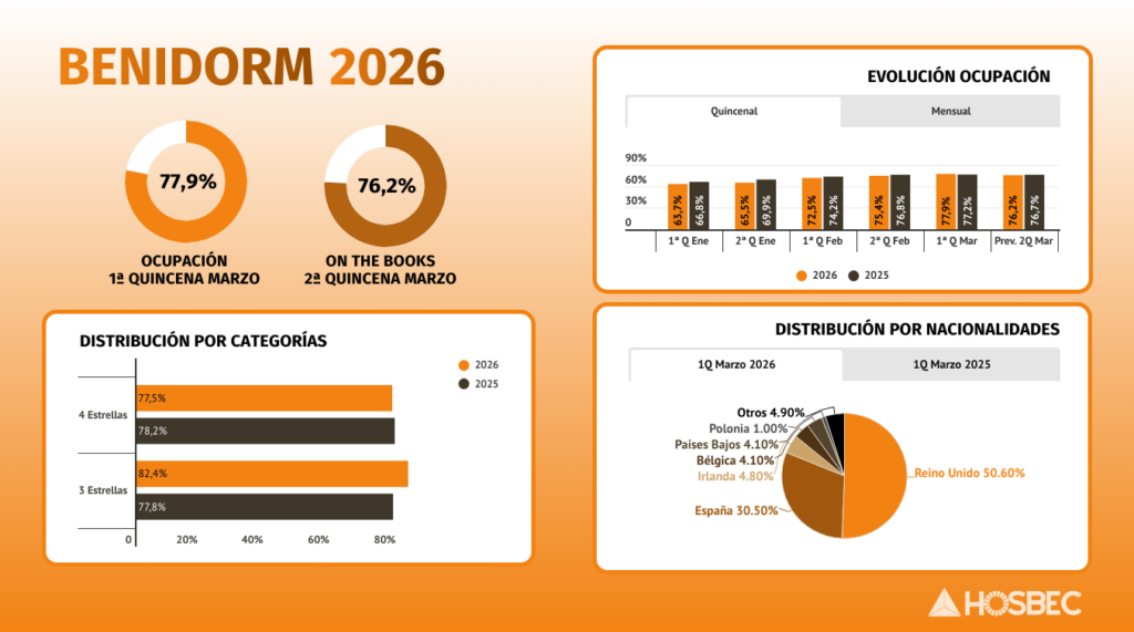 Benidorm arranca marzo manteniendo su elevada capacidad de tracción turística, con una ocupación del 77,9% en la primera quincena, prácticamente en línea con el 77,2% registrado en 2025. Este ligero ajuste se produce en un contexto de estabilidad operativa para el principal destino de la Costa Blanca, que sigue sosteniendo altos niveles de actividad gracias a la fortaleza de su demanda internacional. Las previsiones refuerzan esta tendencia, con un 76,2% de reservas confirmadas para la segunda mitad del mes.