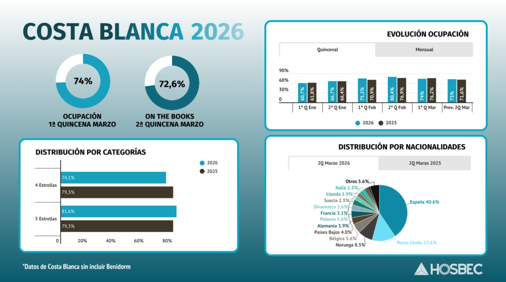 La Costa Blanca, sin incluir Benidorm, arranca marzo con una ligera corrección en la ocupación, situándose en el 74% en la primera quincena, casi dos puntos por debajo del 76,2% registrado en 2025. Aun así, el destino mantiene un nivel de actividad sólido, apoyado en una demanda internacional diversificada que compensa parcialmente la pérdida de peso del mercado nacional. En este contexto, la subzona de Alicante Sur muestra un comportamiento más tensionado alcanzando el 79,4%, pero cede más de cuatro puntos respecto al 83,6% del pasado año, evidenciando un ajuste más acusado en este arranque de marzo.