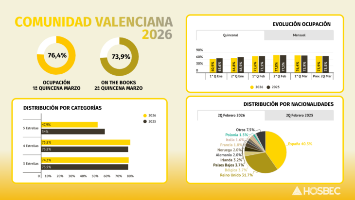 En cuanto a la tipología hotelera, los establecimientos de 4 estrellas mejoran su rendimiento, alcanzando el 76,9%, dos puntos por encima del dato de 2025. Este comportamiento refuerza la idea de una demanda que, aunque aún muy apoyada en el mercado doméstico, empieza a mostrar signos de mayor equilibrio y capacidad de atracción internacional en los meses previos al arranque de la campaña turística principal.