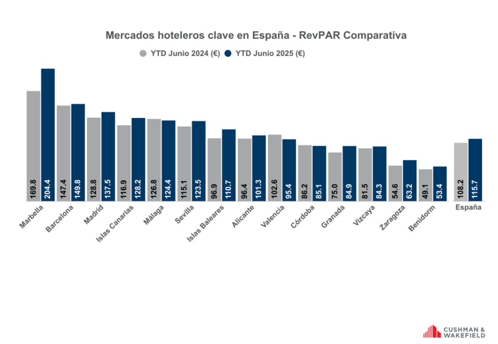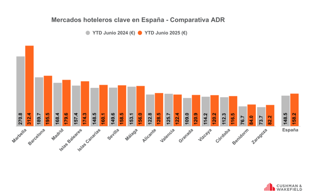 En lo que respecta a la evolución, además de la gran subida del 20,4% en Marbella, destacan también las de Zaragoza (+15,8%), Baleares (+14,3%) y Granada (+13,3%). En cuanto a descensos, Valencia cae un 7% en RevPAR y Málaga y Córdoba, un 1,9% y un 1,3%, respectivamente.