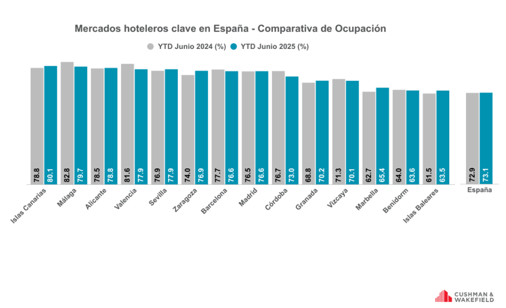 Los destinos que más han subido su porcentaje de ocupación en lo que llevamos de 2025 son Marbella (+4,3%), Zaragoza (+3,9%) y Baleares (+3,2%). Por el contrario, donde más baja la ocupación es en Córdoba (-4,8%) y Valencia (-4,5%). Para Bruno Hallé, socio y codirector de Cushman & Wakefield Hospitality en España,“con una ocupación en máximos, es importante que los hoteles puedan mantener o incluso subir ligeramente precios porque demuestra que la demanda puede asumirlos. Por otro lado, también es una forma de seguir atrayendo un perfil de viajero de mayor poder adquisitivo, aunque ya no se registran crecimientos de dos dígitos como sucedió en 2024”.