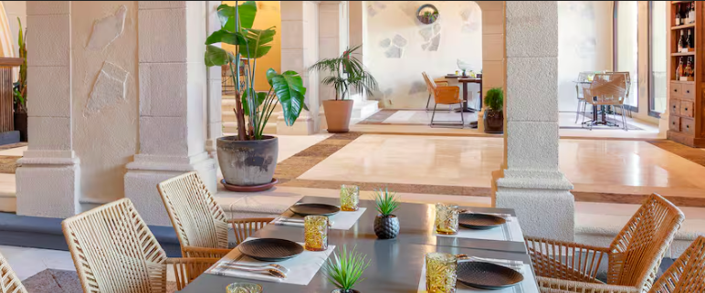 El centro neurálgico del hotel, la Plaza Real de Villaitana donde casi todas las noches se celebran espectáculos, acoge el restaurante Papamambo, muy cosmopolita. Tras una majestuosa fachada que evoca el espectacular Palacio Condal de Cocentaina, aparece este “all day dinning” inundado de luz. Carta para comidas y cenas y una sorprendente coctelería. Ideal para disfrutar de un aperitivo, una cena relajada y un cóctel o bebida al atardecer.