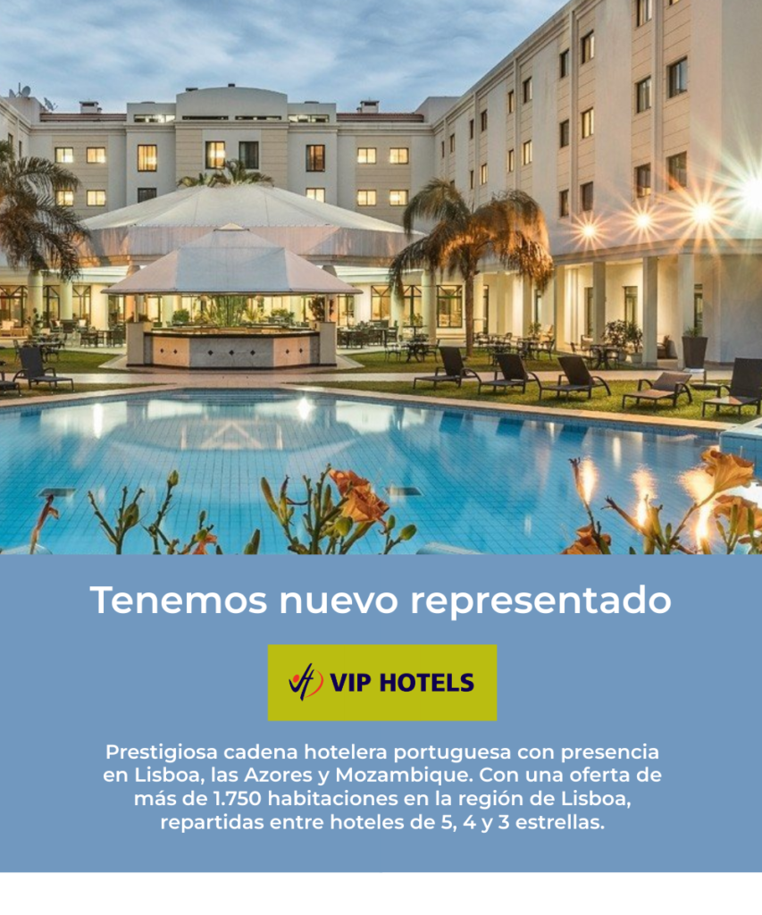 Nos complace anunciar la incorporación de VIP Hotels a nuestra cartera de representados. Esta alianza refuerza nuestro compromiso de ofrecer opciones de alojamiento de primer nivel, conectando a nuestros clientes con una de las cadenas hoteleras más emblemáticas de Portugal.