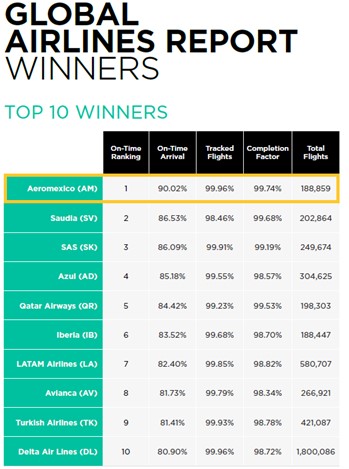 La clasificación de las diez aerolíneas máspuntuales del mundo la completan Aeroméxico (90,02 %), Saudia (86,53 %), SAS (86,09%), Azul (85,18 %), Qatar Airways (84,42 %), LATAM Airlines (82,40 %), Avianca (81,73 %), Turkish Airlines (81,41 %) y Delta Air Lines (80,90 %). En esta categoría compiten las compañías con mayor número de Asiento-Kilómetro-Disponible (ASK por sus siglas en inglés) en el mercado; en concreto, tienen quesituarse dentro del 10% de las aerolíneas con más ASK del mundo y que, además, operen, al menos, en tres regiones.