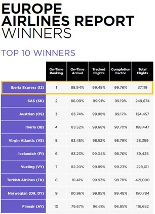 Iberia Express ha sido reconocida como la aerolínea más puntual de Europa, con un porcentaje de puntualidad en llegadas del 88,94 por ciento de 37 000 vuelos.